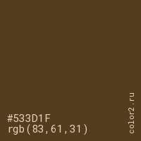 Цвет #533D1F в цветовой модели RGB обозначается тремя октетами (83, 61, 31) в десятичном формате и #533D1F в шестнадцатиричном (hex) формате, которые являются интенсивностью красного 83 (hex 53), интенсивность зелёного 61 (hex 3D) и интенсивность синего 31 (hex 1F).