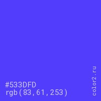 Цвет #533DFD в цветовой модели RGB обозначается тремя октетами (83, 61, 253) в десятичном формате и #533DFD в шестнадцатиричном (hex) формате, которые являются интенсивностью красного 83 (hex 53), интенсивность зелёного 61 (hex 3D) и интенсивность синего 253 (hex FD).