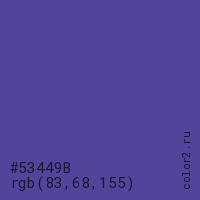 Цвет #53449B в цветовой модели RGB обозначается тремя октетами (83, 68, 155) в десятичном формате и #53449B в шестнадцатиричном (hex) формате, которые являются интенсивностью красного 83 (hex 53), интенсивность зелёного 68 (hex 44) и интенсивность синего 155 (hex 9B).