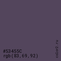 Цвет #53455C в цветовой модели RGB обозначается тремя октетами (83, 69, 92) в десятичном формате и #53455C в шестнадцатиричном (hex) формате, которые являются интенсивностью красного 83 (hex 53), интенсивность зелёного 69 (hex 45) и интенсивность синего 92 (hex 5C).