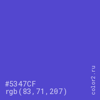 Цвет #5347CF в цветовой модели RGB обозначается тремя октетами (83, 71, 207) в десятичном формате и #5347CF в шестнадцатиричном (hex) формате, которые являются интенсивностью красного 83 (hex 53), интенсивность зелёного 71 (hex 47) и интенсивность синего 207 (hex CF).