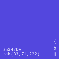 Цвет #5347DE в цветовой модели RGB обозначается тремя октетами (83, 71, 222) в десятичном формате и #5347DE в шестнадцатиричном (hex) формате, которые являются интенсивностью красного 83 (hex 53), интенсивность зелёного 71 (hex 47) и интенсивность синего 222 (hex DE).