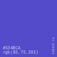 Цвет #534BCA в цветовой модели RGB обозначается тремя октетами (83, 75, 202) в десятичном формате и #534BCA в шестнадцатиричном (hex) формате, которые являются интенсивностью красного 83 (hex 53), интенсивность зелёного 75 (hex 4B) и интенсивность синего 202 (hex CA).
