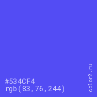 Цвет #534CF4 в цветовой модели RGB обозначается тремя октетами (83, 76, 244) в десятичном формате и #534CF4 в шестнадцатиричном (hex) формате, которые являются интенсивностью красного 83 (hex 53), интенсивность зелёного 76 (hex 4C) и интенсивность синего 244 (hex F4).