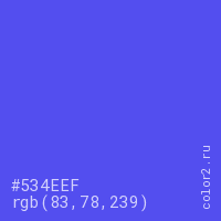 Цвет #534EEF в цветовой модели RGB обозначается тремя октетами (83, 78, 239) в десятичном формате и #534EEF в шестнадцатиричном (hex) формате, которые являются интенсивностью красного 83 (hex 53), интенсивность зелёного 78 (hex 4E) и интенсивность синего 239 (hex EF).