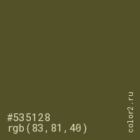 Цвет #535128 в цветовой модели RGB обозначается тремя октетами (83, 81, 40) в десятичном формате и #535128 в шестнадцатиричном (hex) формате, которые являются интенсивностью красного 83 (hex 53), интенсивность зелёного 81 (hex 51) и интенсивность синего 40 (hex 28).