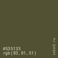 Цвет #535133 в цветовой модели RGB обозначается тремя октетами (83, 81, 51) в десятичном формате и #535133 в шестнадцатиричном (hex) формате, которые являются интенсивностью красного 83 (hex 53), интенсивность зелёного 81 (hex 51) и интенсивность синего 51 (hex 33).