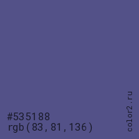 Цвет #535188 в цветовой модели RGB обозначается тремя октетами (83, 81, 136) в десятичном формате и #535188 в шестнадцатиричном (hex) формате, которые являются интенсивностью красного 83 (hex 53), интенсивность зелёного 81 (hex 51) и интенсивность синего 136 (hex 88).