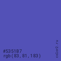 Цвет #5351B7 в цветовой модели RGB обозначается тремя октетами (83, 81, 183) в десятичном формате и #5351B7 в шестнадцатиричном (hex) формате, которые являются интенсивностью красного 83 (hex 53), интенсивность зелёного 81 (hex 51) и интенсивность синего 183 (hex B7).