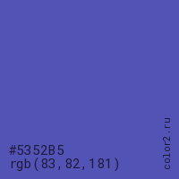 Цвет #5352B5 в цветовой модели RGB обозначается тремя октетами (83, 82, 181) в десятичном формате и #5352B5 в шестнадцатиричном (hex) формате, которые являются интенсивностью красного 83 (hex 53), интенсивность зелёного 82 (hex 52) и интенсивность синего 181 (hex B5).