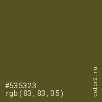 Цвет #535323 в цветовой модели RGB обозначается тремя октетами (83, 83, 35) в десятичном формате и #535323 в шестнадцатиричном (hex) формате, которые являются интенсивностью красного 83 (hex 53), интенсивность зелёного 83 (hex 53) и интенсивность синего 35 (hex 23).