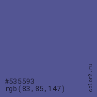 Цвет #535593 в цветовой модели RGB обозначается тремя октетами (83, 85, 147) в десятичном формате и #535593 в шестнадцатиричном (hex) формате, которые являются интенсивностью красного 83 (hex 53), интенсивность зелёного 85 (hex 55) и интенсивность синего 147 (hex 93).