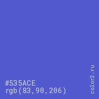 Цвет #535ACE в цветовой модели RGB обозначается тремя октетами (83, 90, 206) в десятичном формате и #535ACE в шестнадцатиричном (hex) формате, которые являются интенсивностью красного 83 (hex 53), интенсивность зелёного 90 (hex 5A) и интенсивность синего 206 (hex CE).