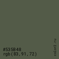 Цвет #535B48 в цветовой модели RGB обозначается тремя октетами (83, 91, 72) в десятичном формате и #535B48 в шестнадцатиричном (hex) формате, которые являются интенсивностью красного 83 (hex 53), интенсивность зелёного 91 (hex 5B) и интенсивность синего 72 (hex 48).