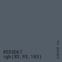Цвет #535D67 в цветовой модели RGB обозначается тремя октетами (83, 93, 103) в десятичном формате и #535D67 в шестнадцатиричном (hex) формате, которые являются интенсивностью красного 83 (hex 53), интенсивность зелёного 93 (hex 5D) и интенсивность синего 103 (hex 67).