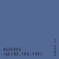 Цвет #536995 в цветовой модели RGB обозначается тремя октетами (83, 105, 149) в десятичном формате и #536995 в шестнадцатиричном (hex) формате, которые являются интенсивностью красного 83 (hex 53), интенсивность зелёного 105 (hex 69) и интенсивность синего 149 (hex 95).