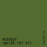 Цвет #536B2F в цветовой модели RGB обозначается тремя октетами (83, 107, 47) в десятичном формате и #536B2F в шестнадцатиричном (hex) формате, которые являются интенсивностью красного 83 (hex 53), интенсивность зелёного 107 (hex 6B) и интенсивность синего 47 (hex 2F).