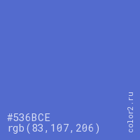 Цвет #536BCE в цветовой модели RGB обозначается тремя октетами (83, 107, 206) в десятичном формате и #536BCE в шестнадцатиричном (hex) формате, которые являются интенсивностью красного 83 (hex 53), интенсивность зелёного 107 (hex 6B) и интенсивность синего 206 (hex CE).