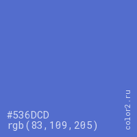 Цвет #536DCD в цветовой модели RGB обозначается тремя октетами (83, 109, 205) в десятичном формате и #536DCD в шестнадцатиричном (hex) формате, которые являются интенсивностью красного 83 (hex 53), интенсивность зелёного 109 (hex 6D) и интенсивность синего 205 (hex CD).