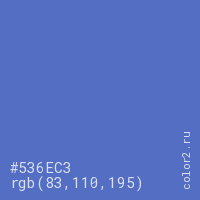 Цвет #536EC3 в цветовой модели RGB обозначается тремя октетами (83, 110, 195) в десятичном формате и #536EC3 в шестнадцатиричном (hex) формате, которые являются интенсивностью красного 83 (hex 53), интенсивность зелёного 110 (hex 6E) и интенсивность синего 195 (hex C3).