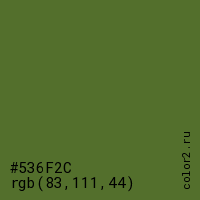 Цвет #536F2C в цветовой модели RGB обозначается тремя октетами (83, 111, 44) в десятичном формате и #536F2C в шестнадцатиричном (hex) формате, которые являются интенсивностью красного 83 (hex 53), интенсивность зелёного 111 (hex 6F) и интенсивность синего 44 (hex 2C).