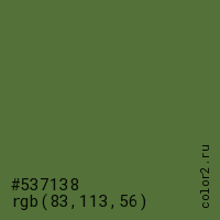 Цвет #537138 в цветовой модели RGB обозначается тремя октетами (83, 113, 56) в десятичном формате и #537138 в шестнадцатиричном (hex) формате, которые являются интенсивностью красного 83 (hex 53), интенсивность зелёного 113 (hex 71) и интенсивность синего 56 (hex 38).