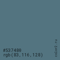 Цвет #537480 в цветовой модели RGB обозначается тремя октетами (83, 116, 128) в десятичном формате и #537480 в шестнадцатиричном (hex) формате, которые являются интенсивностью красного 83 (hex 53), интенсивность зелёного 116 (hex 74) и интенсивность синего 128 (hex 80).