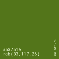 Цвет #53751A в цветовой модели RGB обозначается тремя октетами (83, 117, 26) в десятичном формате и #53751A в шестнадцатиричном (hex) формате, которые являются интенсивностью красного 83 (hex 53), интенсивность зелёного 117 (hex 75) и интенсивность синего 26 (hex 1A).