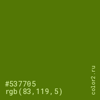 Цвет #537705 в цветовой модели RGB обозначается тремя октетами (83, 119, 5) в десятичном формате и #537705 в шестнадцатиричном (hex) формате, которые являются интенсивностью красного 83 (hex 53), интенсивность зелёного 119 (hex 77) и интенсивность синего 5 (hex 05).