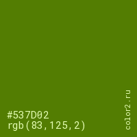 Цвет #537D02 в цветовой модели RGB обозначается тремя октетами (83, 125, 2) в десятичном формате и #537D02 в шестнадцатиричном (hex) формате, которые являются интенсивностью красного 83 (hex 53), интенсивность зелёного 125 (hex 7D) и интенсивность синего 2 (hex 02).