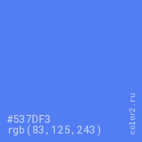 Цвет #537DF3 в цветовой модели RGB обозначается тремя октетами (83, 125, 243) в десятичном формате и #537DF3 в шестнадцатиричном (hex) формате, которые являются интенсивностью красного 83 (hex 53), интенсивность зелёного 125 (hex 7D) и интенсивность синего 243 (hex F3).