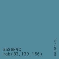 Цвет #538B9C в цветовой модели RGB обозначается тремя октетами (83, 139, 156) в десятичном формате и #538B9C в шестнадцатиричном (hex) формате, которые являются интенсивностью красного 83 (hex 53), интенсивность зелёного 139 (hex 8B) и интенсивность синего 156 (hex 9C).