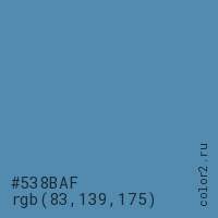 Цвет #538BAF в цветовой модели RGB обозначается тремя октетами (83, 139, 175) в десятичном формате и #538BAF в шестнадцатиричном (hex) формате, которые являются интенсивностью красного 83 (hex 53), интенсивность зелёного 139 (hex 8B) и интенсивность синего 175 (hex AF).