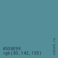 Цвет #538E99 в цветовой модели RGB обозначается тремя октетами (83, 142, 153) в десятичном формате и #538E99 в шестнадцатиричном (hex) формате, которые являются интенсивностью красного 83 (hex 53), интенсивность зелёного 142 (hex 8E) и интенсивность синего 153 (hex 99).