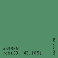Цвет #538F69 в цветовой модели RGB обозначается тремя октетами (83, 143, 105) в десятичном формате и #538F69 в шестнадцатиричном (hex) формате, которые являются интенсивностью красного 83 (hex 53), интенсивность зелёного 143 (hex 8F) и интенсивность синего 105 (hex 69).