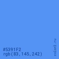 Цвет #5391F2 в цветовой модели RGB обозначается тремя октетами (83, 145, 242) в десятичном формате и #5391F2 в шестнадцатиричном (hex) формате, которые являются интенсивностью красного 83 (hex 53), интенсивность зелёного 145 (hex 91) и интенсивность синего 242 (hex F2).