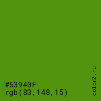 Цвет #53940F в цветовой модели RGB обозначается тремя октетами (83, 148, 15) в десятичном формате и #53940F в шестнадцатиричном (hex) формате, которые являются интенсивностью красного 83 (hex 53), интенсивность зелёного 148 (hex 94) и интенсивность синего 15 (hex 0F).