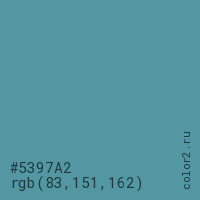 Цвет #5397A2 в цветовой модели RGB обозначается тремя октетами (83, 151, 162) в десятичном формате и #5397A2 в шестнадцатиричном (hex) формате, которые являются интенсивностью красного 83 (hex 53), интенсивность зелёного 151 (hex 97) и интенсивность синего 162 (hex A2).