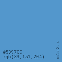Цвет #5397CC в цветовой модели RGB обозначается тремя октетами (83, 151, 204) в десятичном формате и #5397CC в шестнадцатиричном (hex) формате, которые являются интенсивностью красного 83 (hex 53), интенсивность зелёного 151 (hex 97) и интенсивность синего 204 (hex CC).