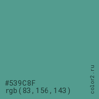 Цвет #539C8F в цветовой модели RGB обозначается тремя октетами (83, 156, 143) в десятичном формате и #539C8F в шестнадцатиричном (hex) формате, которые являются интенсивностью красного 83 (hex 53), интенсивность зелёного 156 (hex 9C) и интенсивность синего 143 (hex 8F).