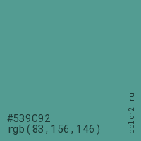 Цвет #539C92 в цветовой модели RGB обозначается тремя октетами (83, 156, 146) в десятичном формате и #539C92 в шестнадцатиричном (hex) формате, которые являются интенсивностью красного 83 (hex 53), интенсивность зелёного 156 (hex 9C) и интенсивность синего 146 (hex 92).