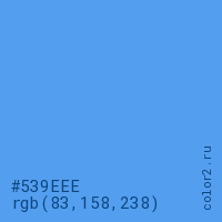 Цвет #539EEE в цветовой модели RGB обозначается тремя октетами (83, 158, 238) в десятичном формате и #539EEE в шестнадцатиричном (hex) формате, которые являются интенсивностью красного 83 (hex 53), интенсивность зелёного 158 (hex 9E) и интенсивность синего 238 (hex EE).