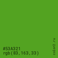 Цвет #53A321 в цветовой модели RGB обозначается тремя октетами (83, 163, 33) в десятичном формате и #53A321 в шестнадцатиричном (hex) формате, которые являются интенсивностью красного 83 (hex 53), интенсивность зелёного 163 (hex A3) и интенсивность синего 33 (hex 21).