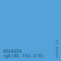 Цвет #53A3DA в цветовой модели RGB обозначается тремя октетами (83, 163, 218) в десятичном формате и #53A3DA в шестнадцатиричном (hex) формате, которые являются интенсивностью красного 83 (hex 53), интенсивность зелёного 163 (hex A3) и интенсивность синего 218 (hex DA).