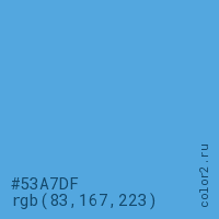 Цвет #53A7DF в цветовой модели RGB обозначается тремя октетами (83, 167, 223) в десятичном формате и #53A7DF в шестнадцатиричном (hex) формате, которые являются интенсивностью красного 83 (hex 53), интенсивность зелёного 167 (hex A7) и интенсивность синего 223 (hex DF).