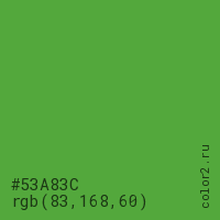 Цвет #53A83C в цветовой модели RGB обозначается тремя октетами (83, 168, 60) в десятичном формате и #53A83C в шестнадцатиричном (hex) формате, которые являются интенсивностью красного 83 (hex 53), интенсивность зелёного 168 (hex A8) и интенсивность синего 60 (hex 3C).