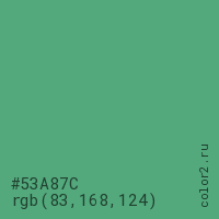 Цвет #53A87C в цветовой модели RGB обозначается тремя октетами (83, 168, 124) в десятичном формате и #53A87C в шестнадцатиричном (hex) формате, которые являются интенсивностью красного 83 (hex 53), интенсивность зелёного 168 (hex A8) и интенсивность синего 124 (hex 7C).