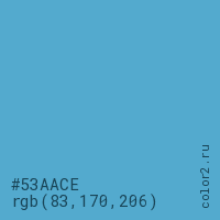 Цвет #53AACE в цветовой модели RGB обозначается тремя октетами (83, 170, 206) в десятичном формате и #53AACE в шестнадцатиричном (hex) формате, которые являются интенсивностью красного 83 (hex 53), интенсивность зелёного 170 (hex AA) и интенсивность синего 206 (hex CE).