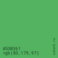 Цвет #53B361 в цветовой модели RGB обозначается тремя октетами (83, 179, 97) в десятичном формате и #53B361 в шестнадцатиричном (hex) формате, которые являются интенсивностью красного 83 (hex 53), интенсивность зелёного 179 (hex B3) и интенсивность синего 97 (hex 61).