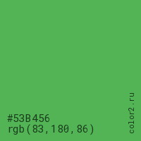 Цвет #53B456 в цветовой модели RGB обозначается тремя октетами (83, 180, 86) в десятичном формате и #53B456 в шестнадцатиричном (hex) формате, которые являются интенсивностью красного 83 (hex 53), интенсивность зелёного 180 (hex B4) и интенсивность синего 86 (hex 56).